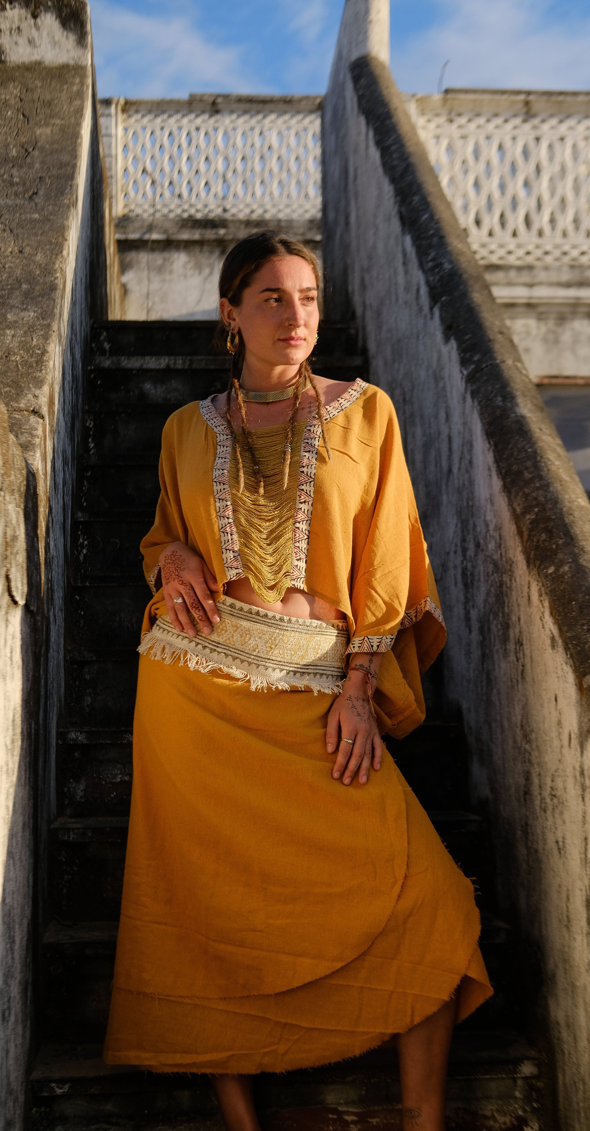 Falda étnica envolvente en yute y blockprint.