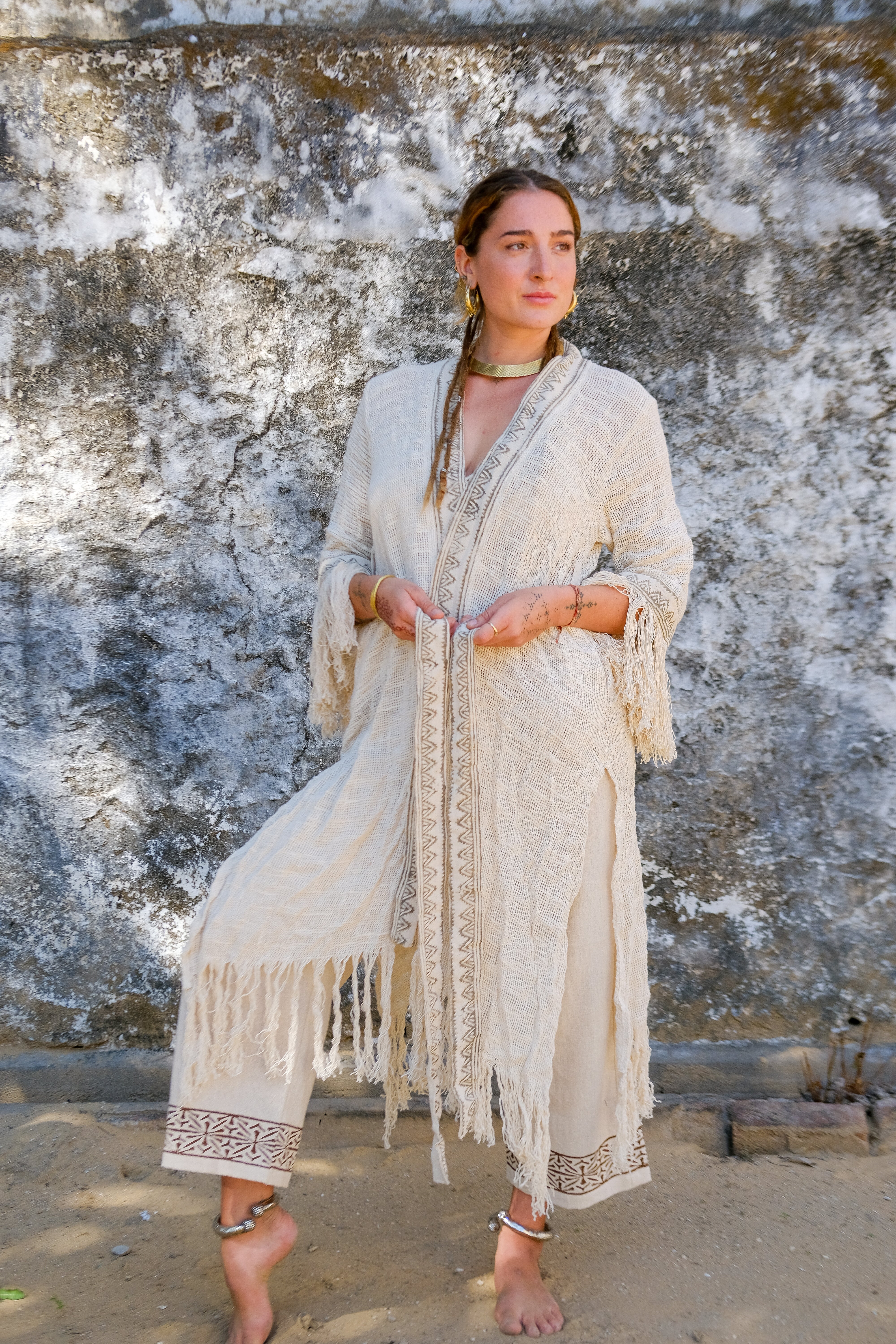 Kimono largo cerrado de manga larga de 3/4 confeccionado en` cotton-jute y estampado blockprint