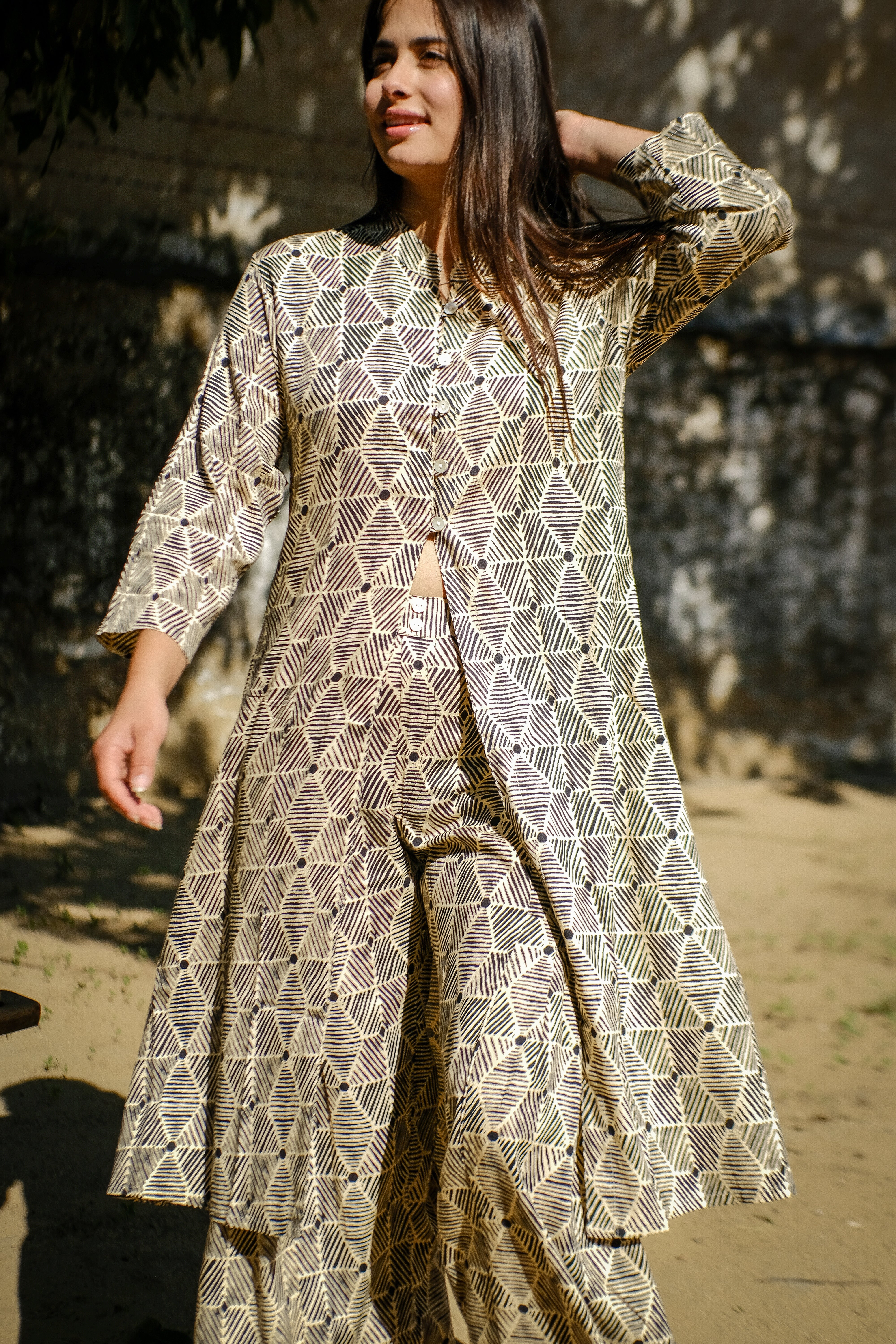 Conjunto de kurta con manga de 3/4 semiabierto y abotonado hasta la mitad y pantalón largo confeccionado en rayón. Combínalos juntos o por separado para dar juego a tu look. Consultanos para adquirirlos por separado.